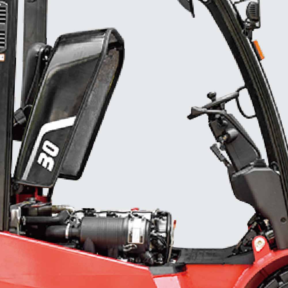 The vehicle has an optimized layout design, reduced front overhang, lowered center of gravity and improved stability of the entire forklift. The new channel steel, ultra-wide-view mast and lowered dashboard in the cab broaden the front view of the driver significantly. Profiled steel overhead guard features high strength with good sealing of the cab.