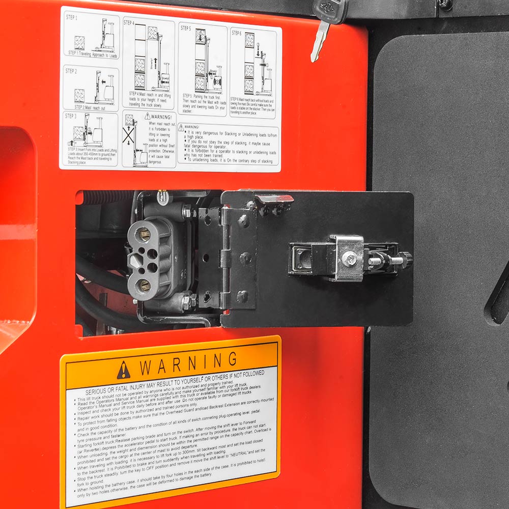 Charging plug inside operator's compartment, this eliminates the need to disconnect the plug from battery, enhancing ease of operation (Std.)