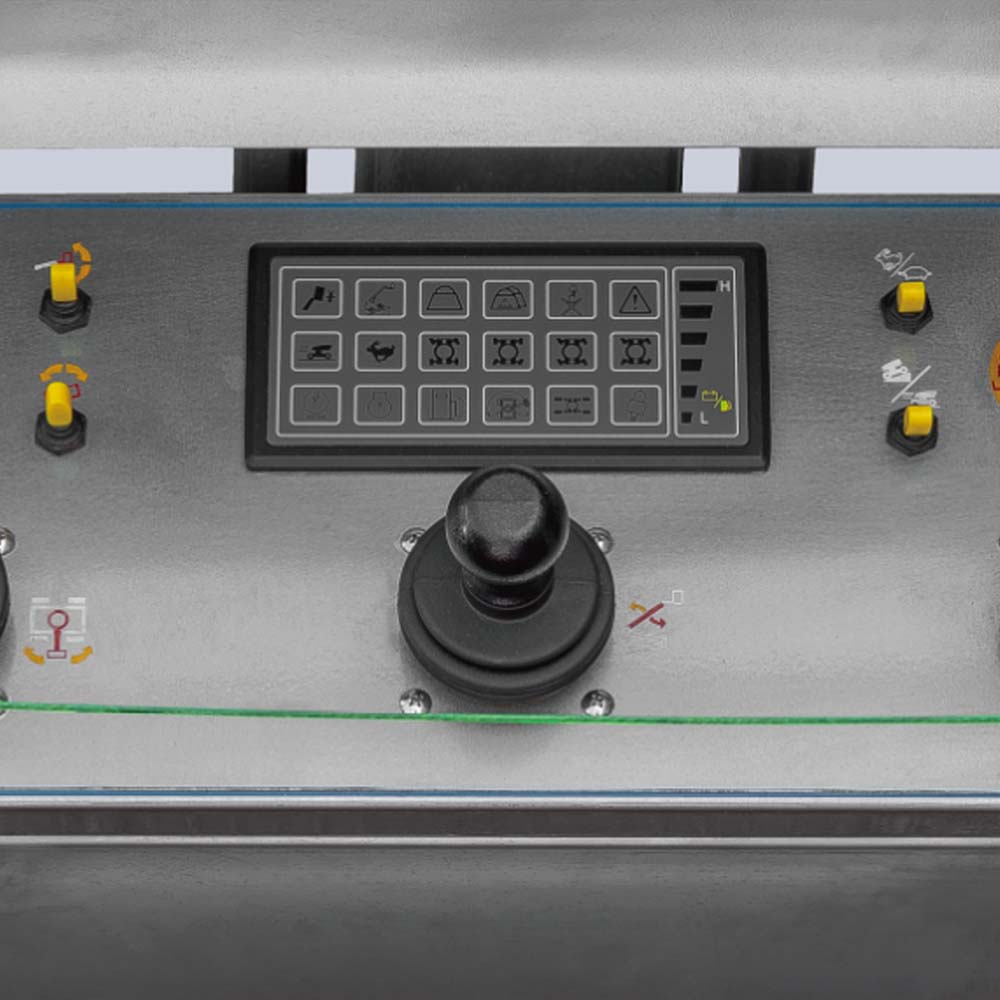It has a base control and a platform control system that use commutation switches to convert. The basket control is used to lock the base control. The two systems are protected by shields.