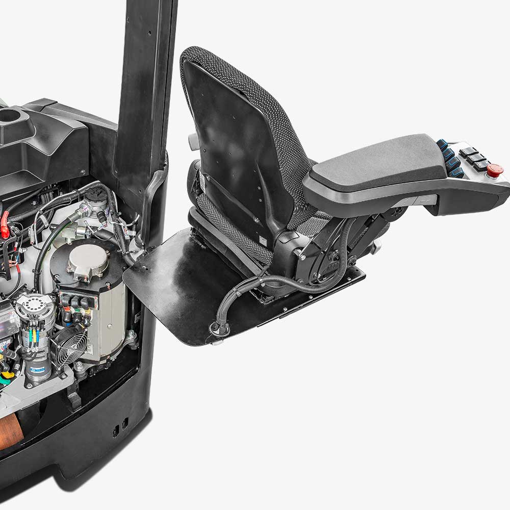 The battery pack can be replaced quickly. The driver can unlock and remove the battery while sitting on his seat. The hood can be easily dismounted and mounted to facilitate routine maintenance operations.